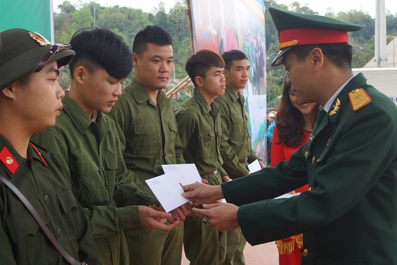 Thiếu tá Phạm Bắc Hà, Trưởng ban Thanh niên Quân khu 1 tặng quà động viên tân binh lên đường nhập ngũ