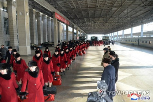 Trước đó một ngày, đoàn văn công rời thủ đô Bình Nhưỡng đến thành phố biển Wonsan để lên phà sang Hàn Quốc. Các nghệ sĩ xuất hiện tại ga tàu ở Bình Nhưỡng với đồng phục áo khoác đỏ và mũ lông màu đen.