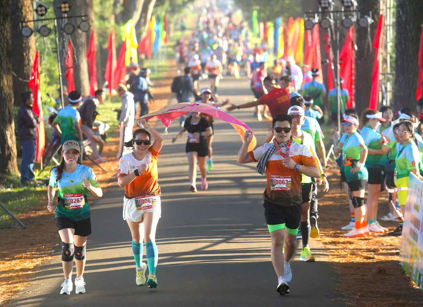 | Hàng thông cổ thụ che mát cho vận động viên khi về đích. Ảnh: Bi Ly |