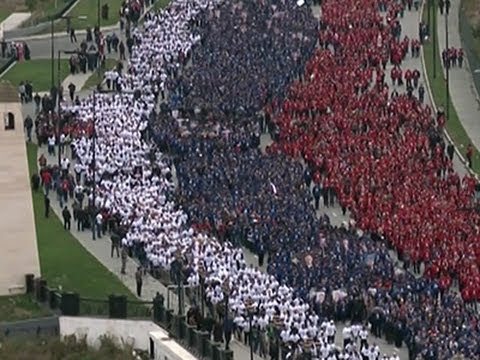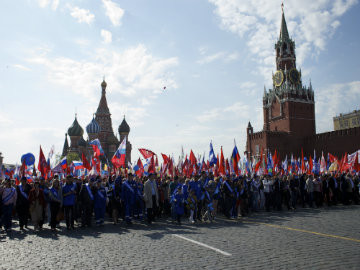 Hàng dài người mang theo cờ, chân dung ông Putin, diễu hành trên đường phố.