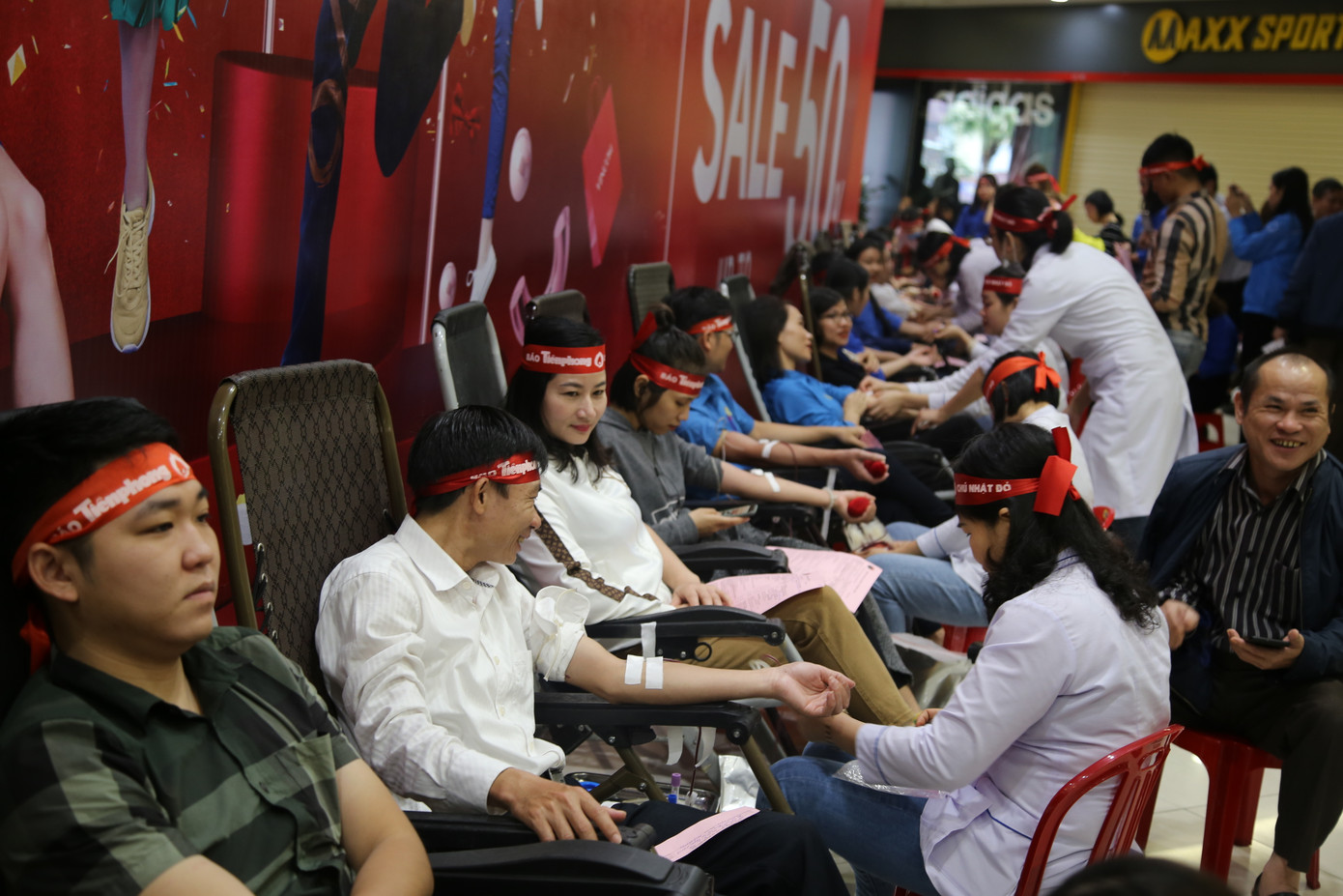 Những nụ cười của người hiến máu trong ngày hội Chủ nhật Đỏ.