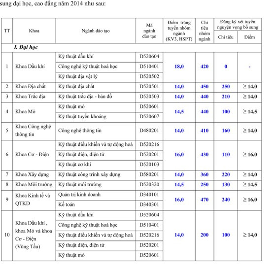 Chỉ tiêu và mức điểm xét tuyển vào các ngành năm 2014 của ĐH Mỏ- Địa chất như sau: