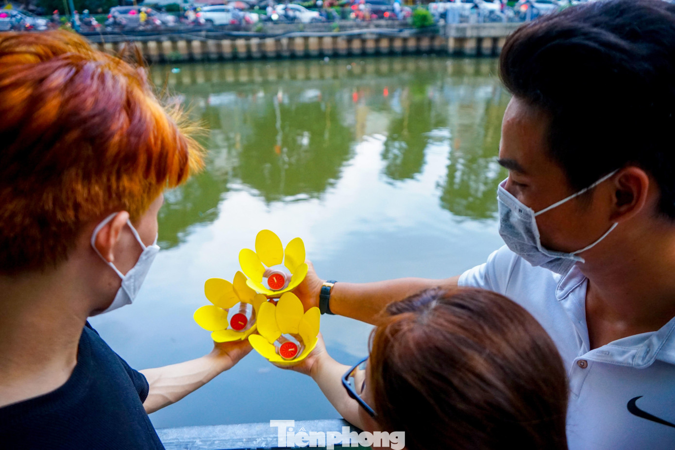 Sau khi các sư thầy tại chùa thực hiện nghi lễ rước đèn cho đêm thả hoa đăng, hàng ngàn người dân cùng nhau xếp hàng dài bên kênh Nhiêu Lộc - Thị Nghè lần lượt thả hoa đăng xuống kênh.