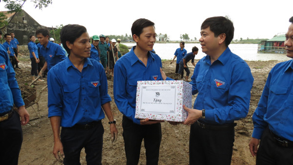 Anh Nguyễn Long Hải, Bí thư TƯ Đoàn tặng quà cho ĐVTN tình nguyện đang giúp dân phường Quảng Thuận, thị xã Ba Đồn don dẹp vệ sinh sau lũ.