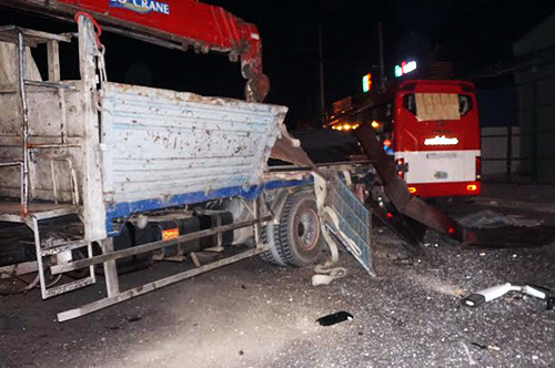Trong khi đó, phần đuôi xe tải cẩu cũng bị hư hỏng, hàng chục tấm ván đang được chở trên xe văng xa hàng chục mét, may lúc đó đường vắng nên không trúng ai. Tài xế xe tải không bị thương.