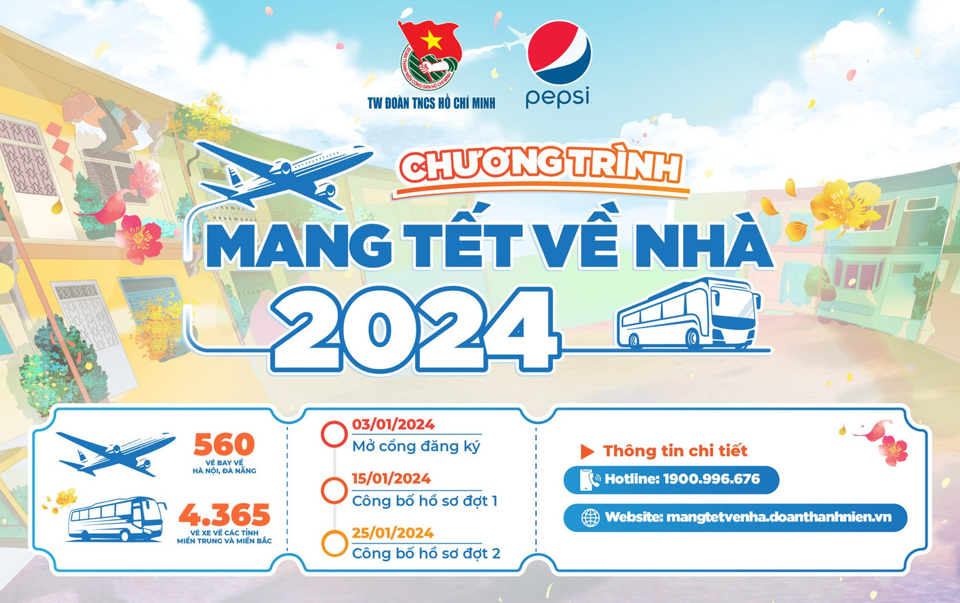 Ngày 3/1, chương trình "Mang Tết về nhà" năm 2024 chính thức mở cổng đăng ký vé hỗ trợ sinh viên, thanh niên công nhân và người lao động về quê đón Tết. Đây là chương trình do Trung ương Đoàn phối hợp Công ty TNHH Nước Giải khát Suntory PepsiCo Việt Nam tổ chức.