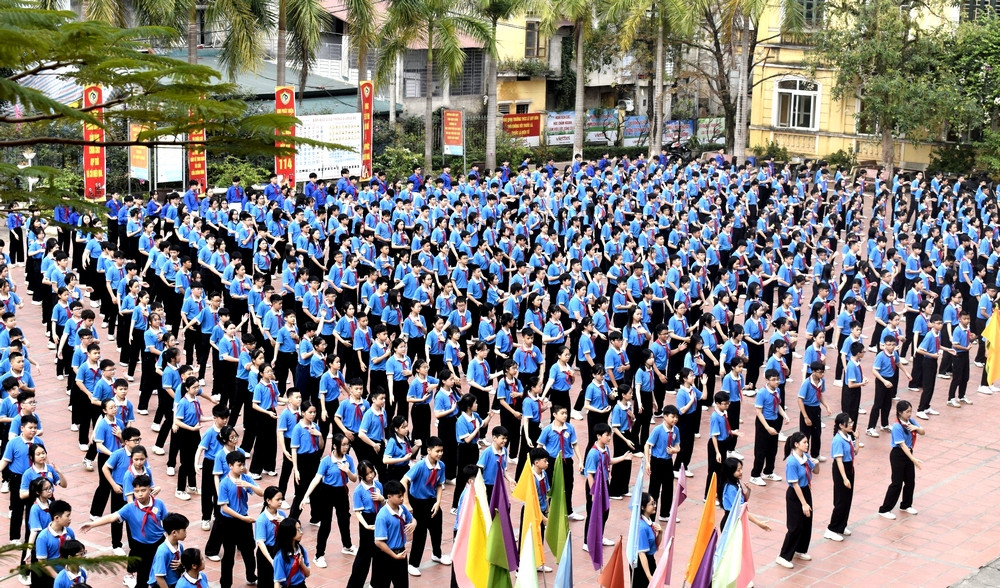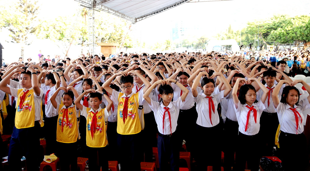 | Hơn 5 triệu em đội viên, thiếu nhi của hơn 10 ngàn trường THCS trên cả nước đồng diễn bài “Tiến bước dưới cờ Đoàn và Lof Malto - Khi nào mình lớn”. |