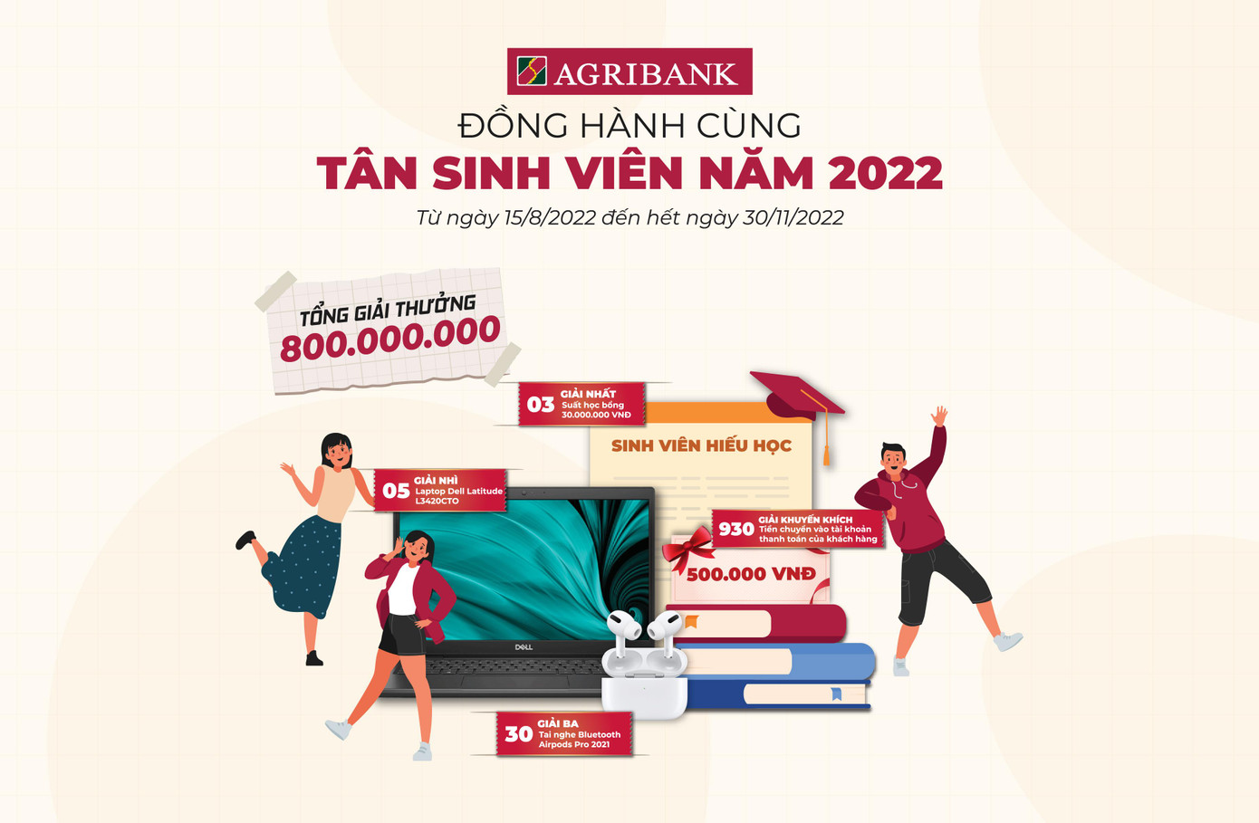 Cụ thể, từ ngày 15/08/2022 đến hết 30/11/2022, tất cả khách hàng là Tân sinh viên năm học 2022 – 2023 thực hiện đăng ký mở tài khoản tiền gửi thanh toán và đồng thời đăng ký dịch vụ Thẻ (Thẻ liên kết sinh viên/Thẻ ghi nợ nội địa) hoặc một trong số các dịch vụ Mobile Banking (SMS Banking/Agribank E-Mobile Banking) sẽ được nhận 01 mã khách hàng – đây cũng chính là mã dự thưởng để tham gia chương trình “Agribank đồng hành cùng Tân sinh viên năm 2022” với gần 1000 giải thưởng hấp dẫn, tổng giá trị lên tới 800 triệu đồng.