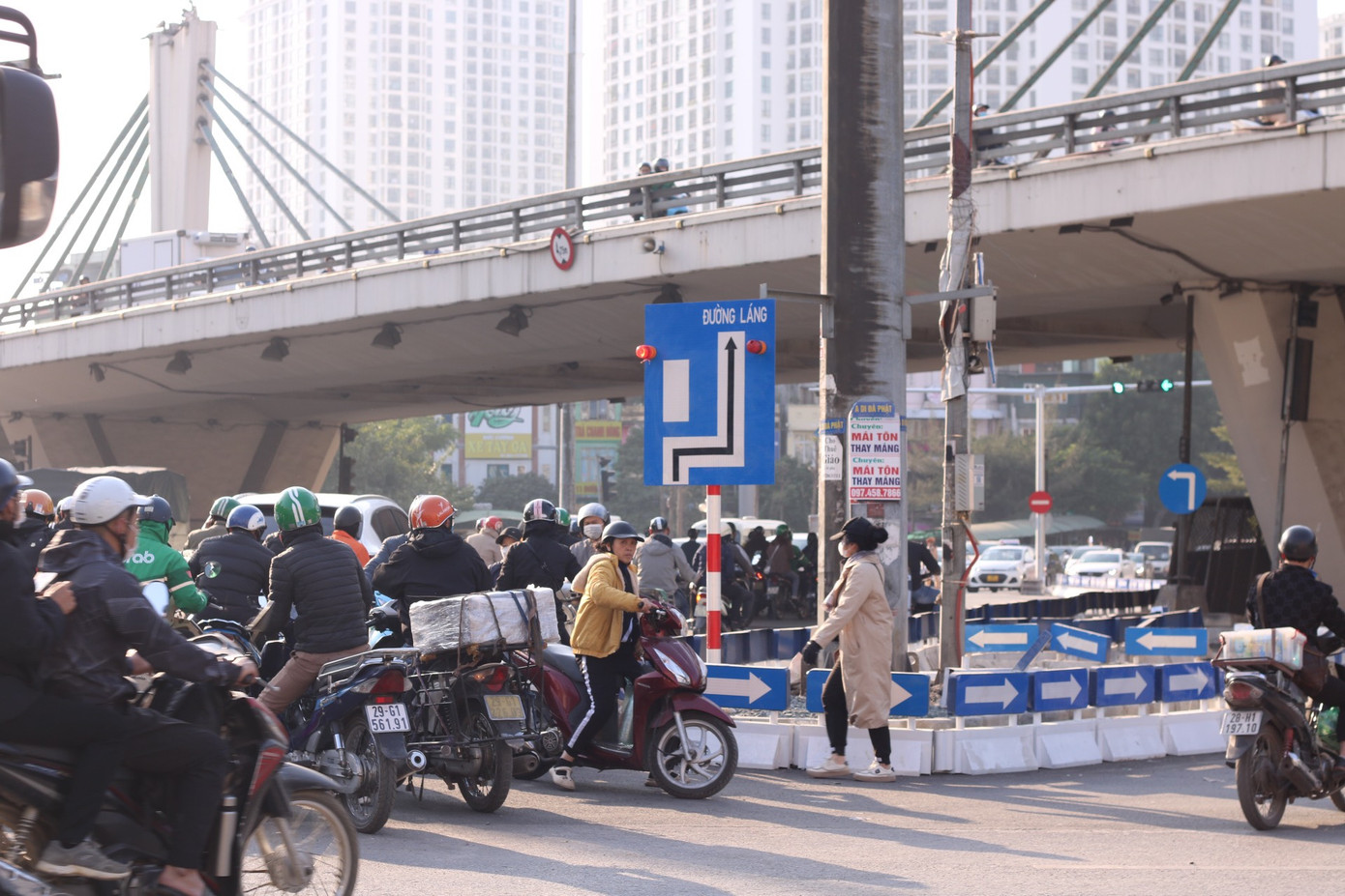 Ghi nhận trong ngày 25/12, lực lượng CSGT, Thanh tra giao thông đã có mặt tại nút giao Ngã Tư Sở - Trường Chinh từ sớm, để hướng dẫn người dân. Tuy nhiên, nhiều người điều khiển ô tô, xe máy vẫn khá lúng túng với cách phân luồng mới tại nút giao này.