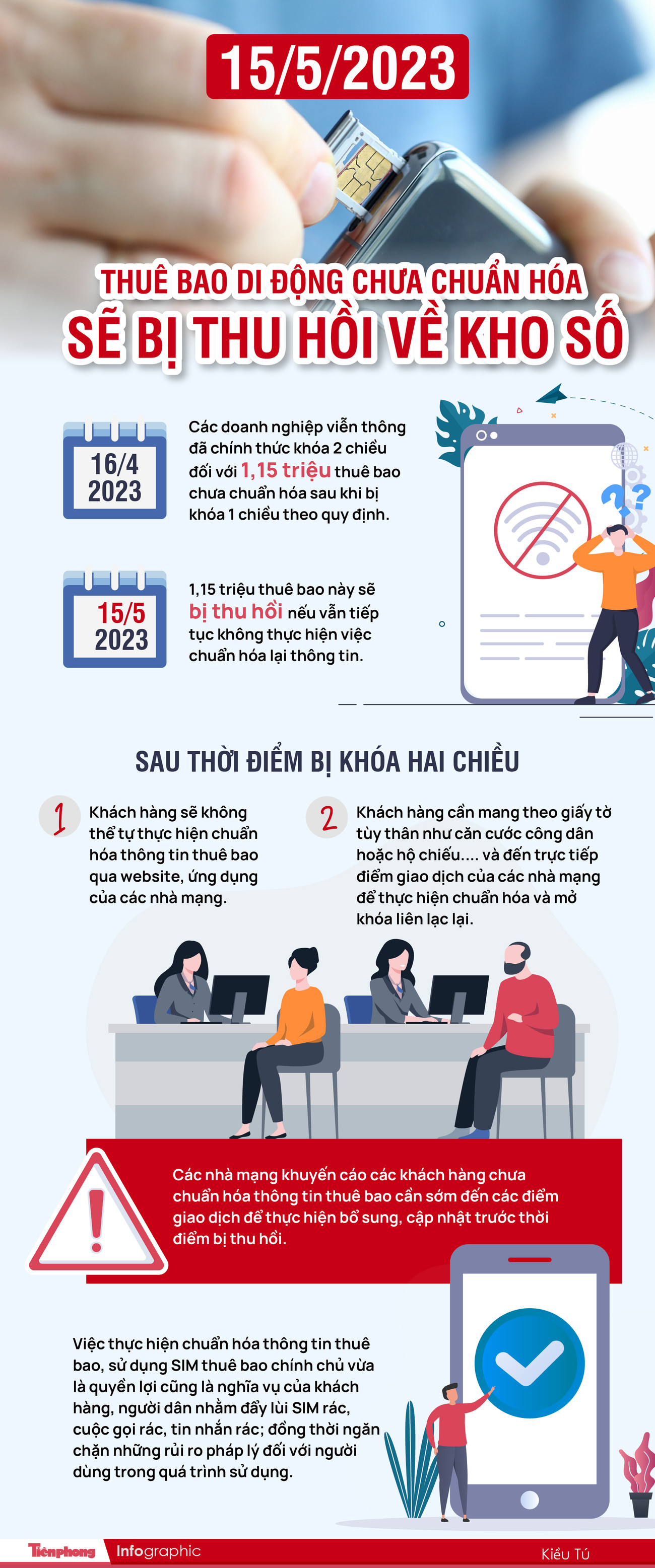 TPO - Theo Cục Viễn thông (Bộ Thông tin và Truyền thông), đến 15/5/2023, 1,15 triệu thuê bao này sẽ bị thu hồi nếu vẫn tiếp tục không thực hiện việc chuẩn hóa lại thông tin.