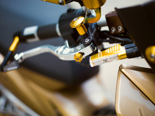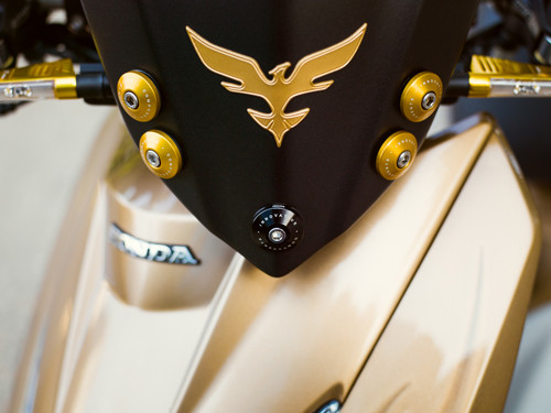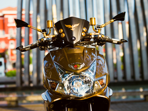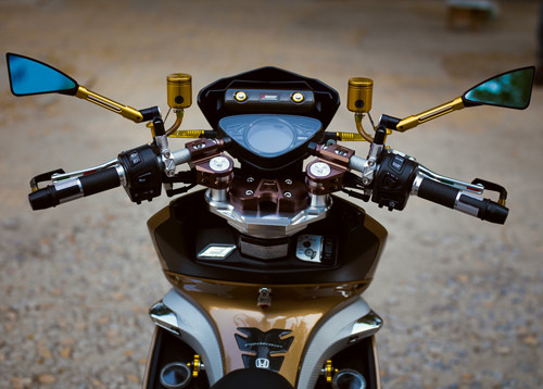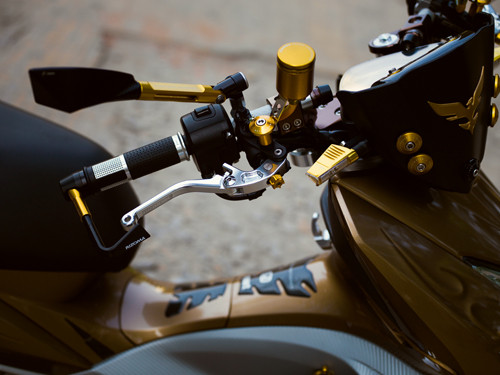 Đầu xe được Quốc Thắng, anh chàng làm trong ngành công nghệ thông tin chăm chút nhất. Cặp gương chiếu hậu tạo hình thể thao của Rizoma Tomok, cụm tay lái hay cặp đèn LED cũng của hãng đồ chơi nổi tiếng Rizoma. Bên cạnh đầu xe, các chi tiết nhỏ khác trên xe cũng được chăm chút cùng tông vàng như gác chân, chụp pô xe Biker, hệ thống đĩa phanh thêm nổi bật.