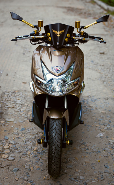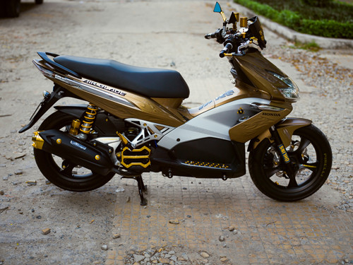 Honda Air Blade vốn đã không có nét thể thao, hiếu chiến như đối thủ Yamaha Nouvo, do đó chủ nhân thay đổi một loạt các bộ phận trên xe bằng đồ chơi, tất cả đều mang màu vàng sang trọng, nổi bật.