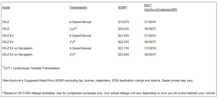 CR-Z thế hệ 2013 trên thị trường Mỹ gồm bản tiêu chuẩn và bản EX, có giá khởi điểm từ 19.975 USD (chưa bao gồm 790 USD phí vận chuyển).