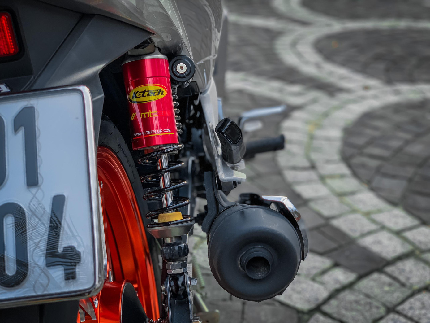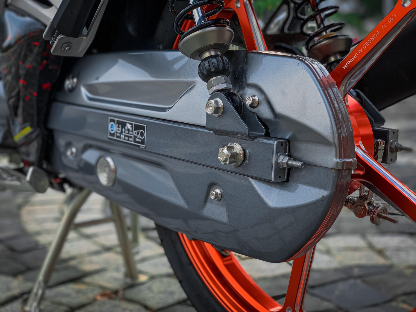 Điểm đặc biệt của chiếc xe số độ này là được gắn thêm thanh giảm chấn Ohlins. Nó có tác dụng ổn định tay lái theo chiều ngang. Nguyên lý hoạt động của bộ phận này dựa trên hệ thống treo quen thuộc, đó là sử dụng áp suất dầu di chuyển qua lại trong một bình chứa dạng ống hẹp và dài. Khi chạy qua ổ gà hoặc để nhấc bánh trước lên khỏi mặt đường và khi hạ bánh xuống, nếu bánh trước chỉ cần lệch một chút so với hướng di chuyển của bánh sau sẽ dẫn đến toàn thân xe mất đi tính ổn định. Ở tình huống này chỉ cần thiếu kinh nghiệm xử lý, tay lái non hoặc mất bình tĩnh thì rất dễ gặp tai nạn. Do đó, nếu được trang bị trợ lực thì sẽ dập tắt rung động, không để tay lái bị lệch về một phương.