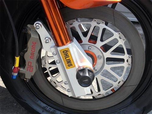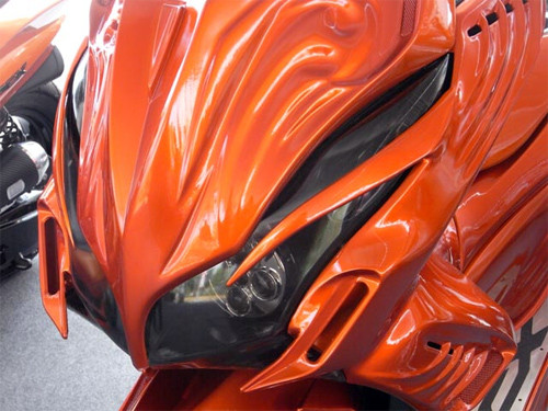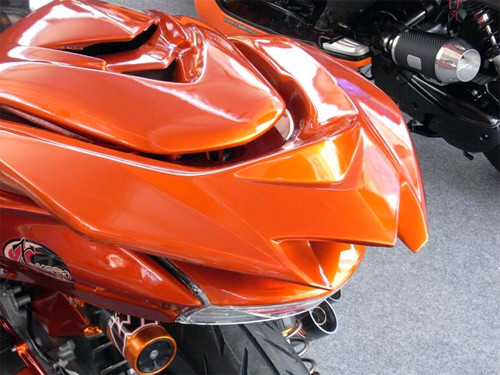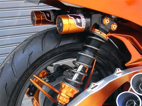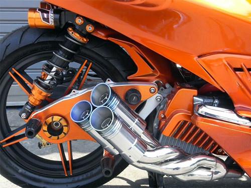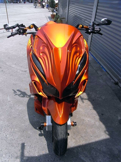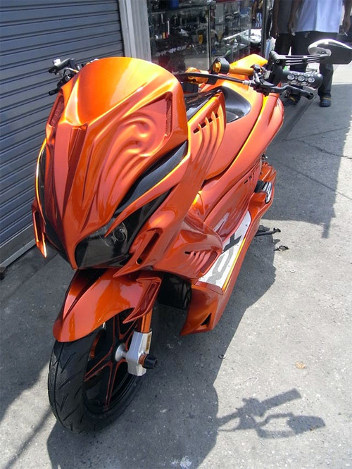 Chiếc scooter nổi bật với dàn áo màu cam, mặt nạ dữ dằn, ống xả 3 trong một, giảm xóc trước sau thể thao và nhiều chi tiết hàng hiệu.