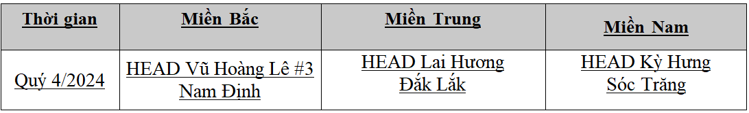 Trong quý 4/2024, HVN ghi nhận những đóng góp của các HEAD trong hoạt động đào tạo ATGT và đặc biệt tuyên dương các HEAD có hoạt động tích cực nhất trên khắp 3 miền Bắc – Trung – Nam. Cụ thể như sau:
