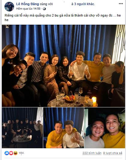 Trước đó, trong trận chung kết SEA Games 30, Hồng Đăng cũng gây “bão” khi chia sẻ: "Ngay khi ngồi xem đá mấy phút đầu anh đã tin là thắng lớn rồi. Hôm tới về cho anh ôm mỗi ông em một cái nhé. Tự hào lắm Việt Nam ơi".