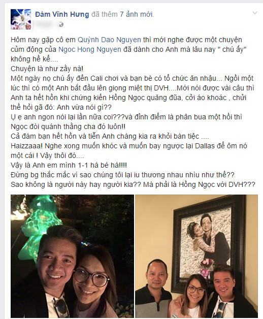 Anh chia sẻ, nghe lại câu chuyện này khiến anh muốn khóc và muốn bay ngược lại Dallas để ôm nữ ca sĩ. "Đừng bao giờ thắc mắc vì sao chúng tôi lại yêu thương nhau nhiều như thế. Sao không là người này hay người kia, mà phải là Hồng Ngọc với Đàm Vĩnh Hưng?".