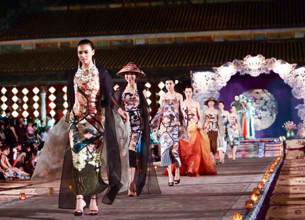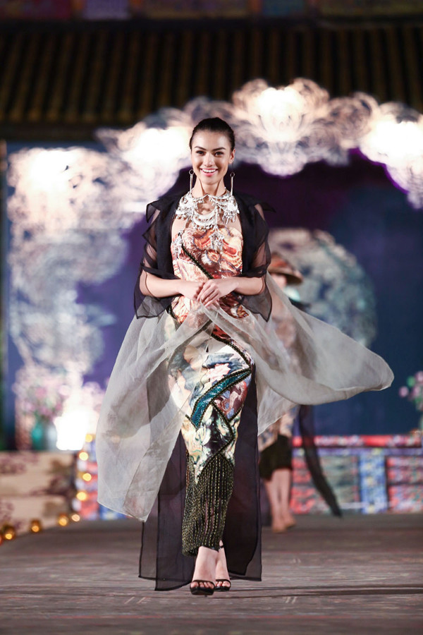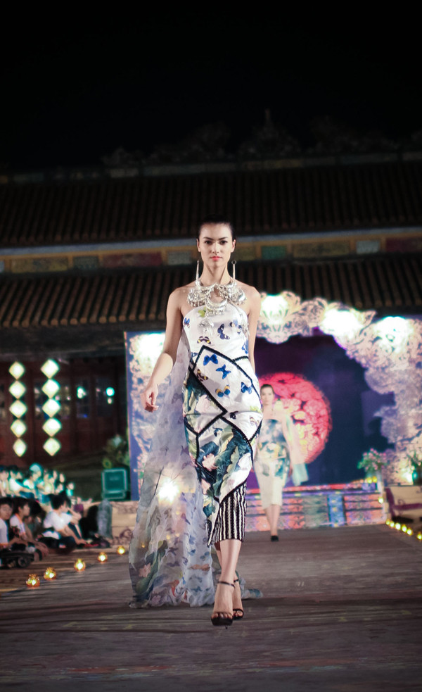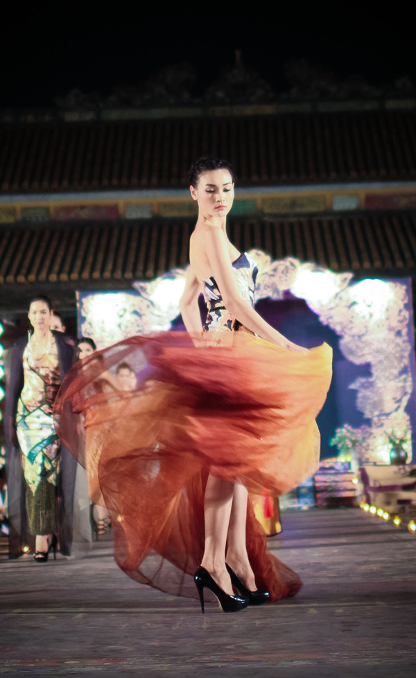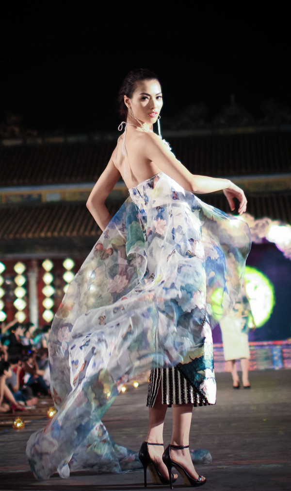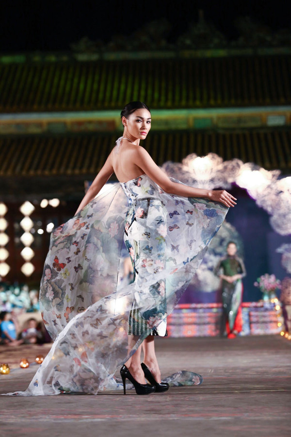 Chân dài miền Bắc được chọn làm gương mặt mở màn cho BST áo dài "dân gian đương đại" của NTK Võ Công Khanh trình diễn trong sự kiện 'Đêm phương Đông' trong khuôn khổ Festival Huế 2014.