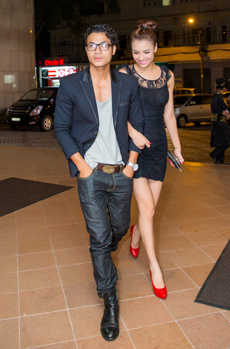 TPO - Nữ người mẫu mặc bộ váy ngắn màu đen bằng chất liệu ren xuyên thấu khoe dáng vóc gợi cảm, sánh vai nam người mẫu Vũ Tuấn Việt tới dự sinh nhật một người bạn thân tối 29/7.