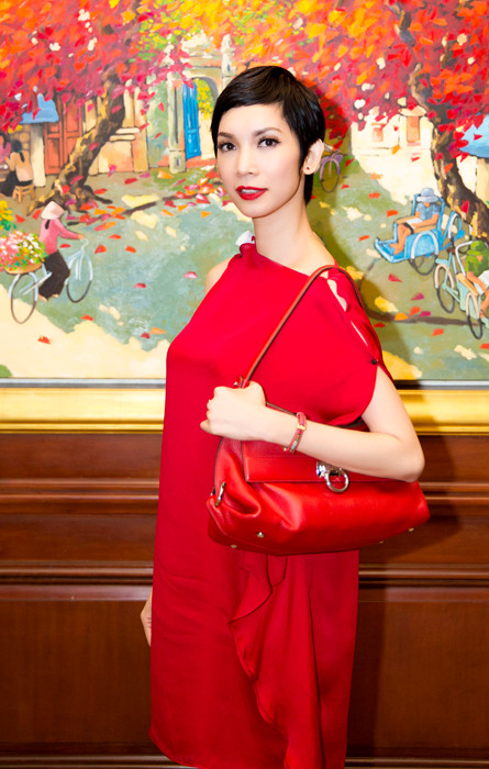 Cựu người mẫu Xuân Lan diện váy đỏ rực rỡ.