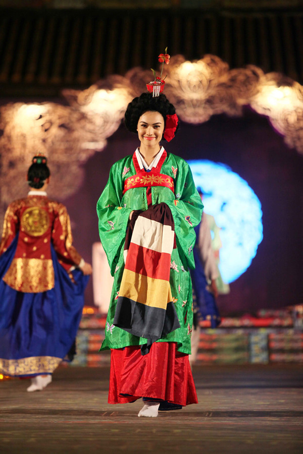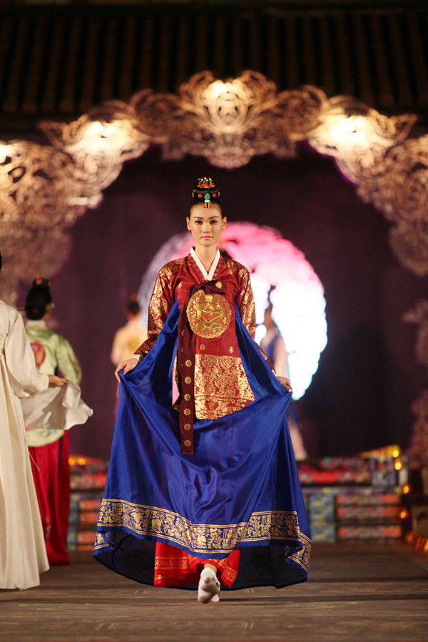Đoàn Hàn Quốc luôn mang tới những chiếc Hanbok nhiều màu sắc bằng vải Oganza truyền thống và những nét thêu tay tinh xảo...Người mẫu Hồng Quế xinh đẹp, dịu dàng khi trình diễn một mẫu Hanbok.