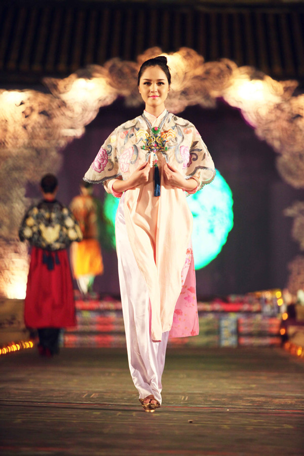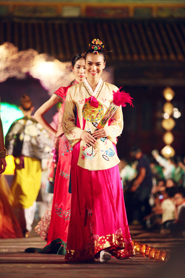 TPO - Nữ người mẫu vô cùng xinh đẹp khi trình diễn trang phục truyền thống của Hàn Quốc trong 'Đêm phương Đông' diễn ra tại sân điện Thái Hòa tối 13/4 trong khuôn khổ Festival Huế 2014.