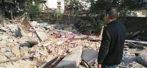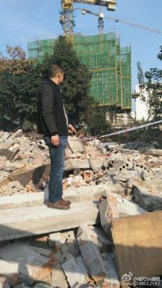 Anh Xu Yong, con rể bà Xianxiu đứng trên đống đổ nát