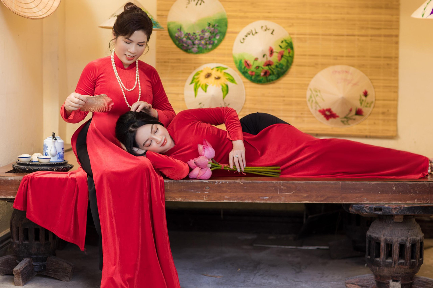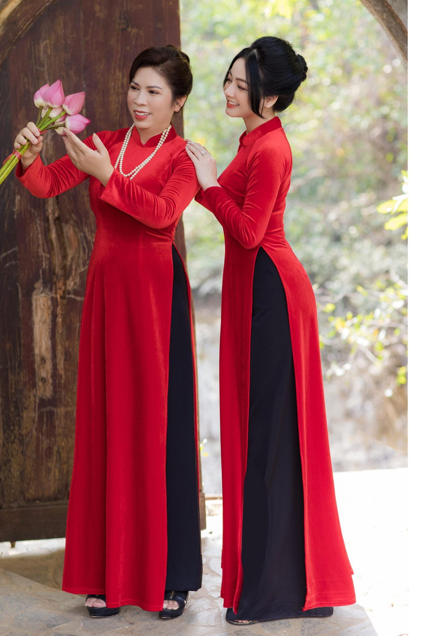 | Quỳnh Trâm xúng xính áo dài đỏ bên mẹ của mình. |