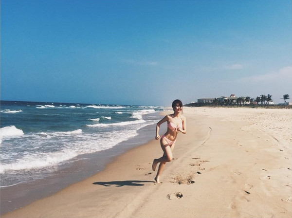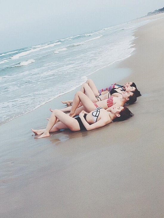 Kỳ nghỉ lễ vừa rồi, Trà My cùng Trà Ngọc Hằng và bạn bè có chuyến du lịch tại Đà Nẵng. Các cô gái tự tin khoe làn da trắng khi nằm trên bãi biển chụp hình.