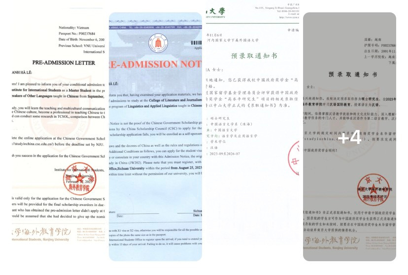 Kết quả, quá trình ứng tuyển học bổng, nữ sinh đã nhận được giấy báo đỗ của nhiều trường: ĐH Nam Kinh, ĐH Đông Nam, ĐH Tứ Xuyên, ĐH Thiên Tân… Và hiện tại, cô bạn quyết định theo đuổi giấc mơ vào ĐH Trung Sơn, với học bổng Chính phủ hệ Thạc sĩ.