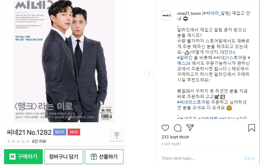 Tạp chí Cine21 thông báo tin tức và gửi lời cảm ơn tới bộ đôi Gong Yoo và Park Bo Gum.