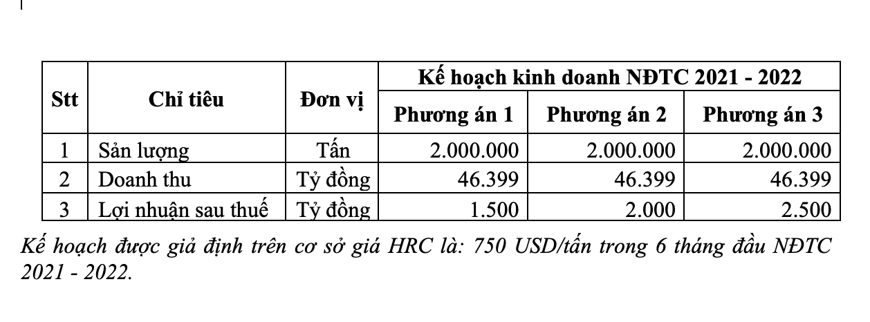 Cụ thể, NĐTC 2021 - 2022 mục tiêu sản lượng tiêu thụ đạt 2.000.000 tấn, doanh thu đạt 46.399 tỷ đồng và lợi nhuận sau thuế từ 1.500 đến 2.500 tỷ đồng phụ thuộc vào diễn biến tình hình dịch bệnh, xung đột chính trị, biến động giá thép, giá năng lượng và các chi phí đầu vào.