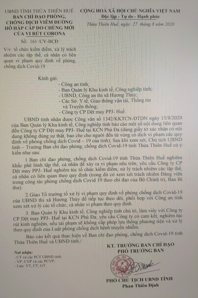 Sau khi xem xét toàn bộ sự việc, ông Phan Ngọc Thọ - Chủ tịch UBND tỉnh, Trưởng Ban chỉ đạo phòng, chống dịch COVID-19 tỉnh TT-Huế, yêu cầu Công ty CP Dệt may PPJ - Huế nghiêm túc tổ chức kiểm điểm, xử lý trách nhiệm các tập thể, cá nhân có liên quan theo quy định, trong đó có xem xét trách nhiệm đảng viên trong công tác phòng, chống dịch COVID-19 theo chỉ đạo của Bộ Chính trị, Ban Bí thư; giao tổ trưởng tổ xử lý vi phạm quy định về phòng, chống dịch COVID-19 của UBND thị xã Hương Thủy tiếp tục theo dõi, phối hợp với Công an tỉnh TT-Huế xem xét xử lý các tổ chức, cá nhân vi phạm theo quy định.