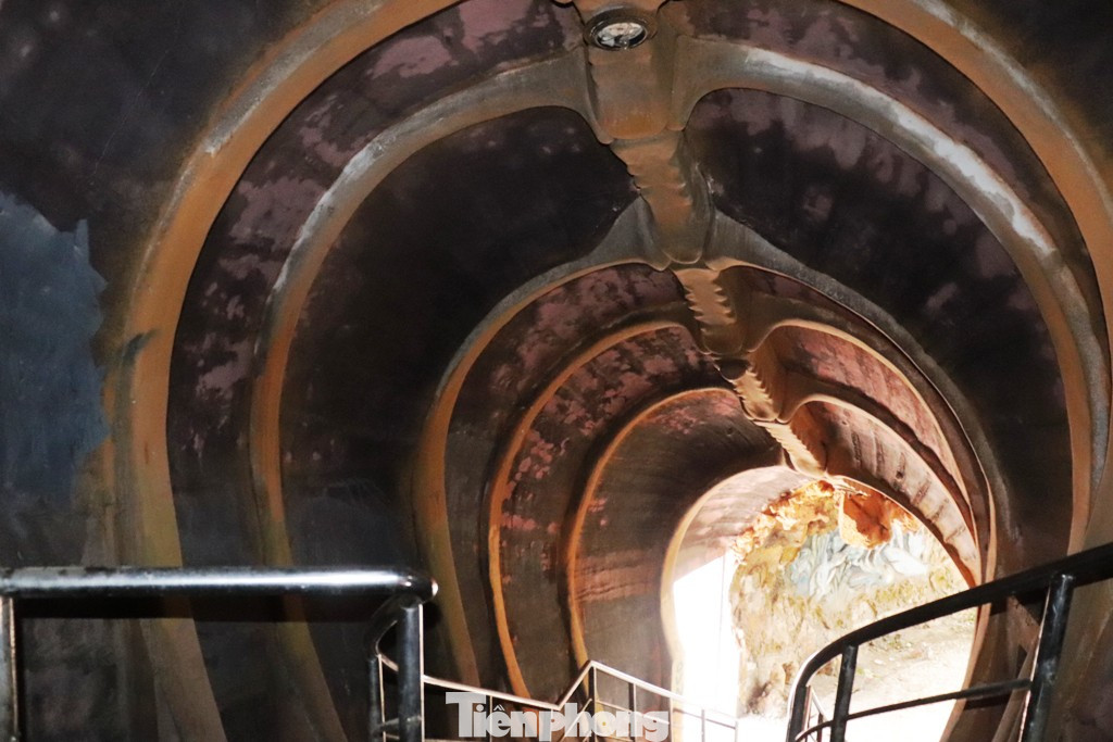 Từ bên trong hàm rồng tăm tối nhìn ra không gian đồi núi vắng lặng bên ngoài.