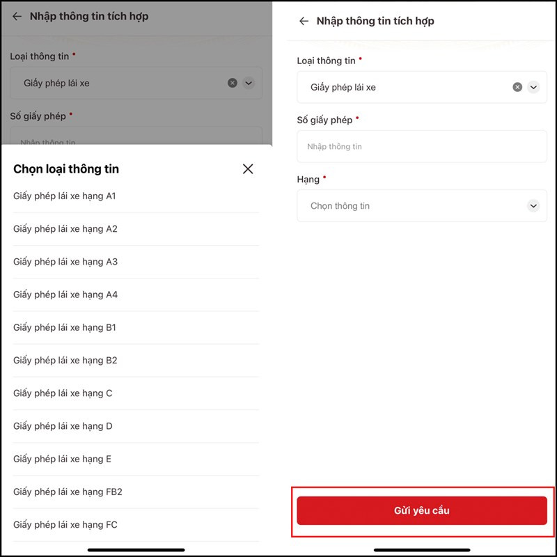 Bước 3: Điền đầy đủ thông tin như số giấy phép hay giấy phép lái xe hạng gì vào đây > Nhấn Gửi yêu cầu và đợi kết quả trả về là xong.