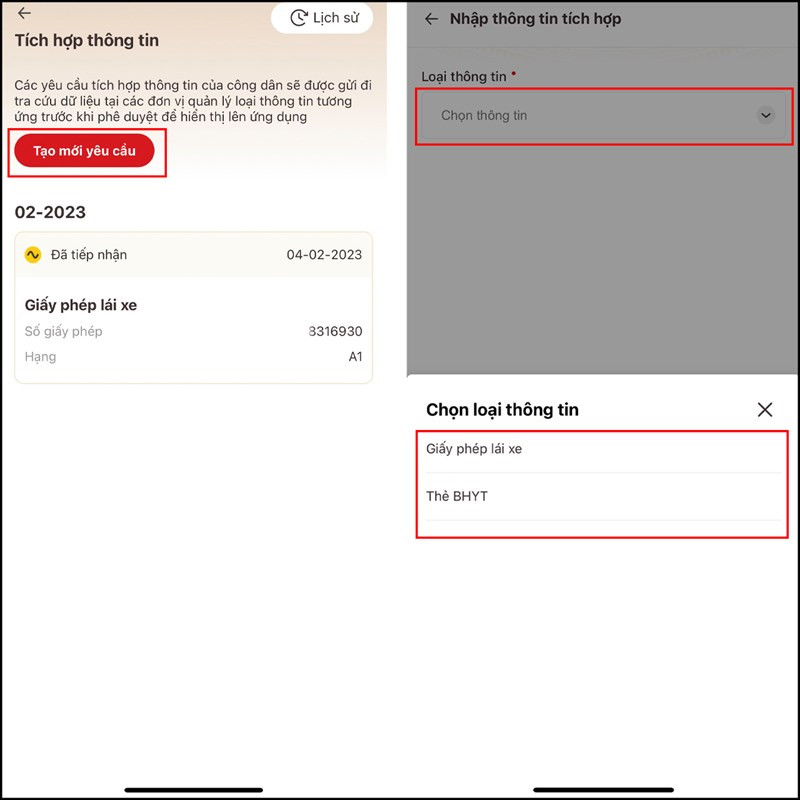 Bước 2: Tiếp theo bạn chọn vào Tạo mới yêu cầu > Nhấn vào Chọn thông tin, lúc này hệ thống sẽ cho bạn chọn giấy tờ bạn muốn tích hợp như Giấy phép lái xe, Bảo hiểm y tế (hiện tại các loại giấy tờ khác như Bảo hiểm xã hội, Hộ chiếu... chưa được tích hợp trên này, bạn vui lòng đợi bản cập nhật sau, ở đây chọn Giấy phép lái xe làm ví dụ).