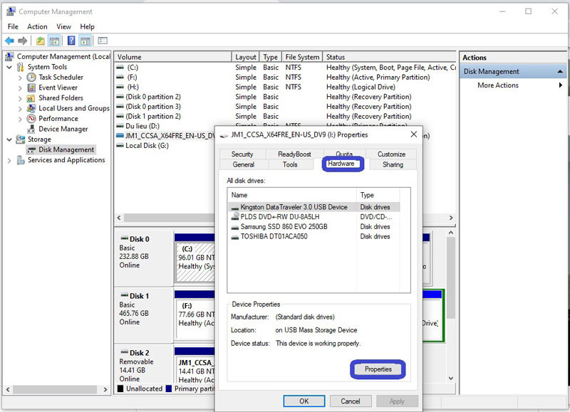 Bước 5: Click vào ô Hardware rồi chọn Properties.