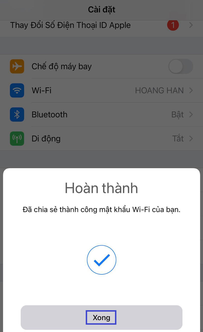 Như vậy, chúng ta đã hoàn tất quá trình chia sẻ mật khẩu Wi-Fi trên 2 chiếc iPhone với nhau.