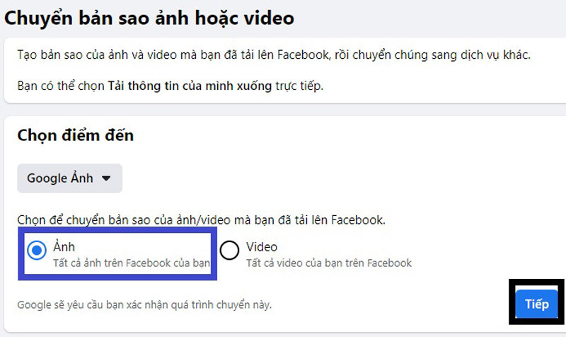 Bước 6: Click vào phần Ảnh hoặc Video rồi chọn Tiếp.