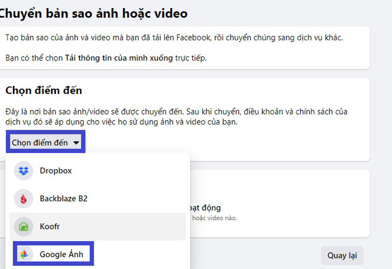 Bước 5: Click vào phần Chọn điểm đến. Sau đó nhấp vào phần Google Ảnh.