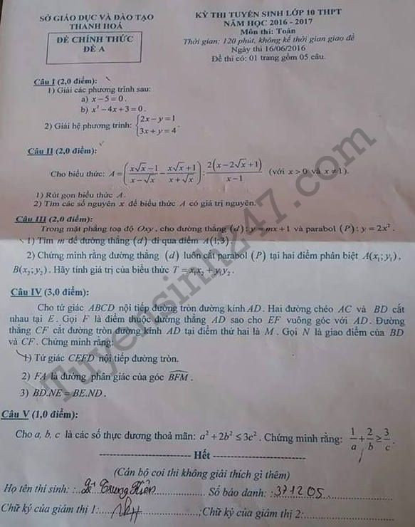 TPO - Sáng 16/6, gần 37 nghìn thí sinh tại Thanh Hóa dự thi vào lớp 10 năm học 2016 - 2017. Dưới đây là đề thi và đáp án môn Toán của tỉnh Thanh Hóa.