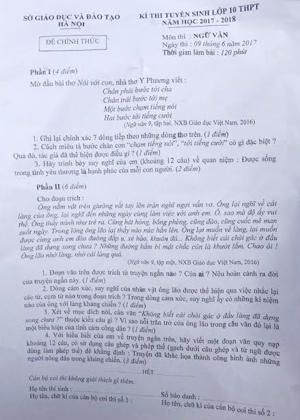 Đề thi Ngữ văn vào lớp 10 công lập đại trà ở Hà Nội sáng 9/6.