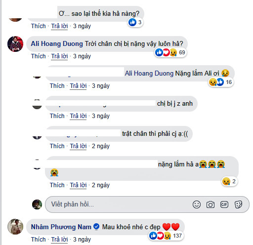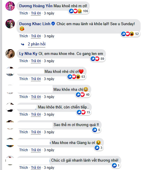 Ngay sau thông tin này, nhiều bạn bè, đồng nghiệp là nghệ sĩ như Ali Hoàng Dương, Dương Hoàng Yến, Dương Khắc Linh, Lý Nhã Kỳ,…cùng các fan hâm mộ bày tỏ sự lo lắng cho sức khỏe của Hương Giang và chúc nữ ca sĩ mau chóng hồi phục..