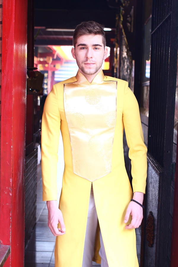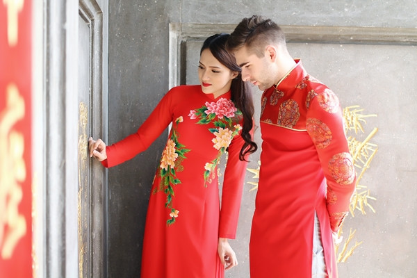 Nữ ca sỹ khéo léo chọn cho Georgi Ganev tà áo dài với màu sắc và hoa văn truyền thống khiến anh vô cùng thích thú.