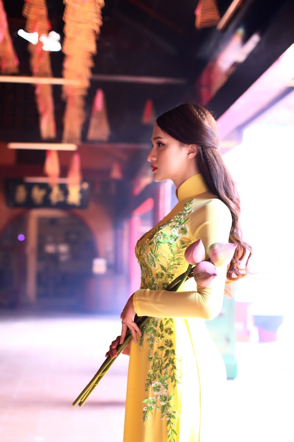 Nữ ca sĩ mặc áo dài màu vàng thêu họa tiết nổi bật, khoe vẻ e ấp và duyên dáng.