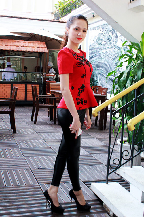 Hương Giang chọn một chiếc áo màu đỏ rực rỡ, kết hợp cùng đôi chân dài thẳng tắp khoe đường cong gợi cảm và nữ tính đáng ngưỡng mộ.