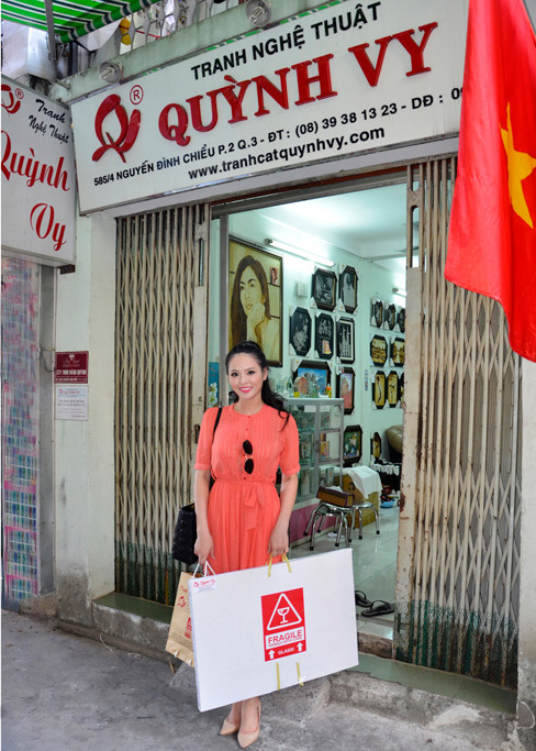 | Hương Thảo tới thăm cửa hàng tranh gạo chỉ một ngày trước khi đi thi Miss World. |