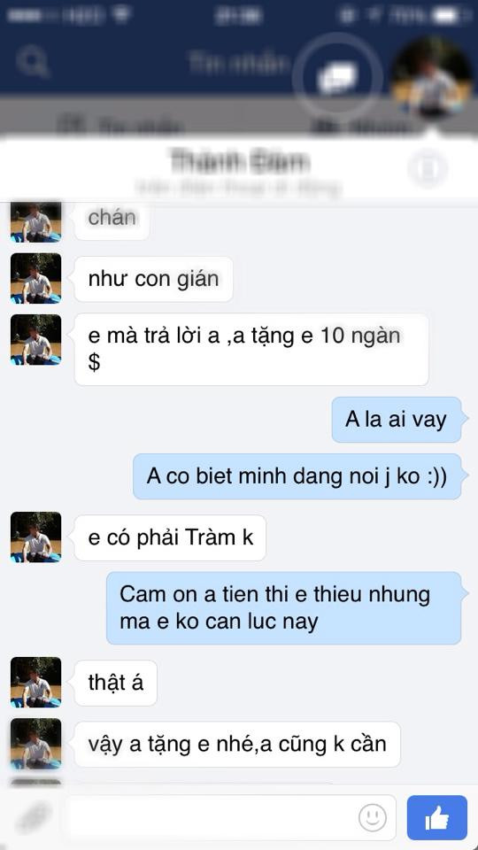 Trong cuộc trò chuyện với Hương Tràm, người này tỏ ra khá hào phóng và hứa: "Em (Hương Tràm - PV) mà trả lời anh, anh tặng em 10 ngàn $".