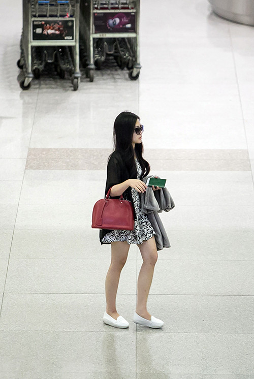 Cô xuất hiện với trang phục váy ngắn họa tiết và giày bệt giản dị. Trông cô có vẻ khá mệt mỏi sau chuyến bay nhiều tiếng đồng hồ.